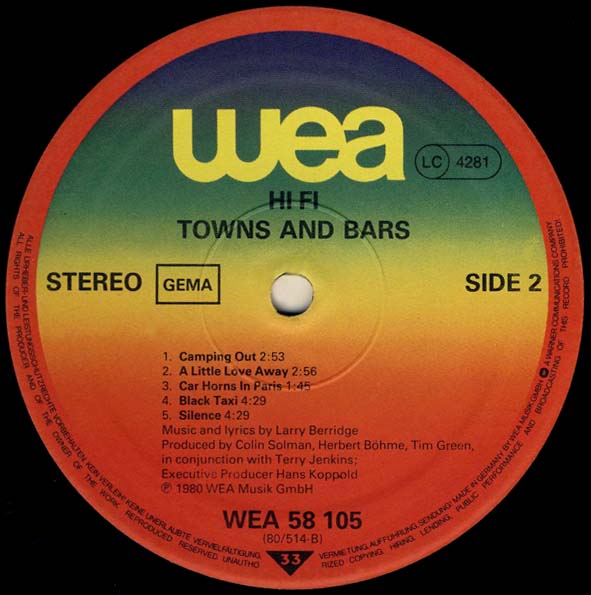 A new demo tape was recorded at Terry’s brother-in-laws’ fledgling studio and handed on to Tim Green from Mungo Jerry, who had emigrated to Hamburg where he began his own production company, Boogietunes. The demo was played to A & R people at the giant Warner-Elektra-Asylum (WEA) company in mid-1979 and they were impressed. The band recorded the first album, ’Towns and Bars,’ at Hafen-Klang studios in Hamburg during October and November. This was released in 1980 with an accompanying single, ‘A Little Love Away’. They were followed by a second collection in 1981, ‘Sing Song,’ and a further single, ‘Don’t Break The Spell.’ Recording sessions for a third album, tentatively titled ‘Gringo’s Revenge,’ got underway in Berlin but this was never completed because the group split up in 1982.