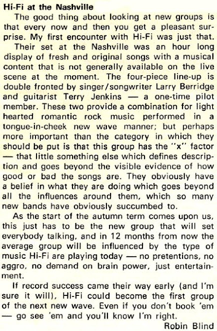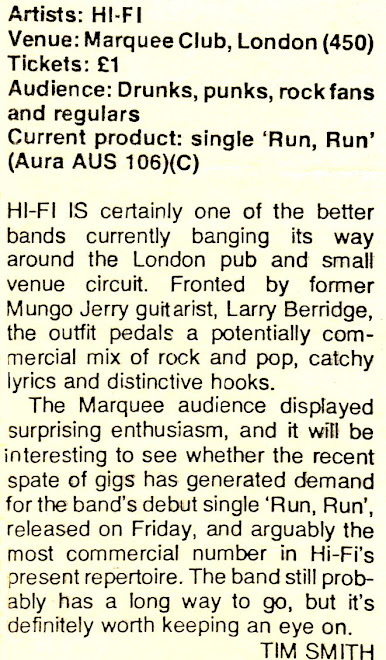 Larry Berridge and Byron Con formed Hi Fi in 1977 with the aid of Billy Lemon and Terry Jenkins. Ray Dorset of Mungo Jerry managed them for a while; (Larry had played bass for Mungo during 1977). In 1978 they taped some rough demos in Terry’s living room, one of which was ‘Run Run.’ By now Bill Gilliam had become their manager, and he played the tape to Aaron Sixx at a small UK label, Aura Records. He liked ‘Run Run’ and took the group into the studio to record it as their first single, with ‘Sole Kitchen’ on the b-side. The demo of ‘Run Run’ featured a gloriously big-scale ending but the powers-that-be decided to fade it before this, and the full ending has never been heard – until now.